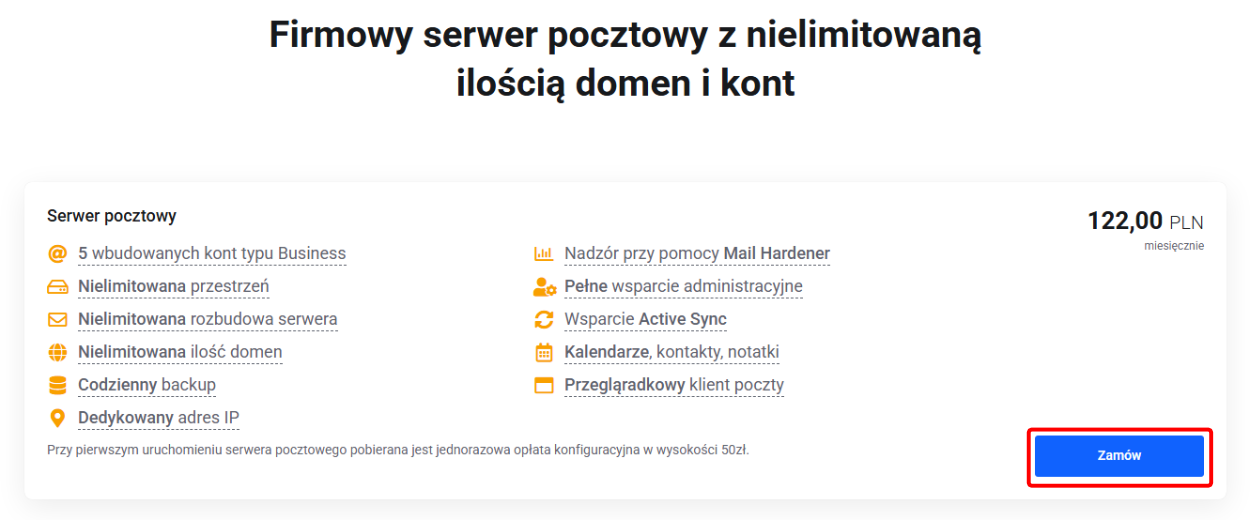 Aby złożyć zamówienie na firmowy serwer pocztowy należy kliknąc przycisk Zamów na karcie produktu.